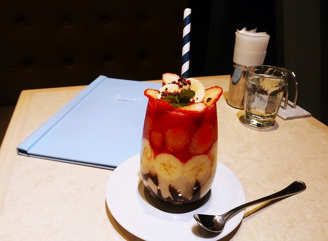 中身は、バナナ・バニラアイス・牛乳・ラズベリー・アップル・ストロベリー・カカオニプ・チョコレートシロップです。