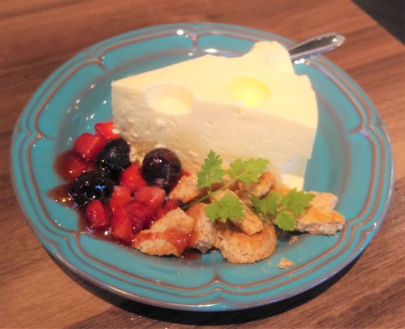 ずっと頼んでみたかったデザートで、ケーキはレアチーズケーキだったんですが、チーズの形ですごい可愛かった🧀