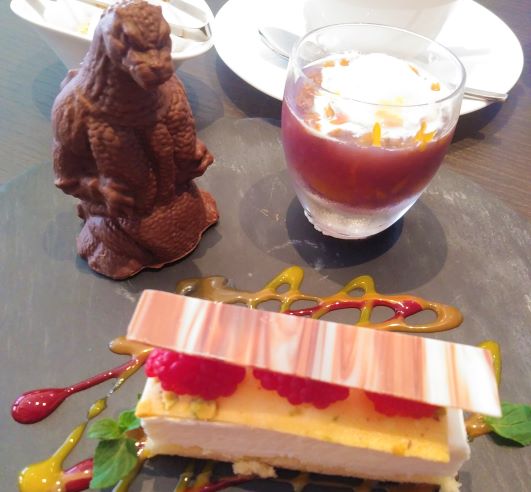 「ゴジラっぽいケーキが出てくるんでしょ(^^)」と思ったら、ケーキとプリン的なデザートが出てきて、盛り付けデザインも繊細!!意外!!しかも味もおいしい。