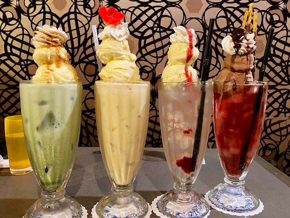 左から抹茶フロート、ラムミルクフロート、ローズクリームソーダ、ブラックチェリークリームソーダ
