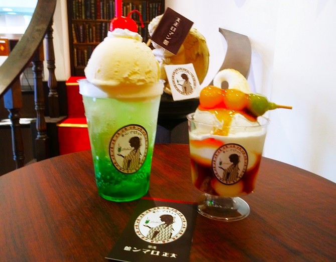 ハイカラクリームソーダめろんは、普通のクリームソーダだけど旗がたってたり…はいからさんみたいな女の子のデザイン。