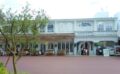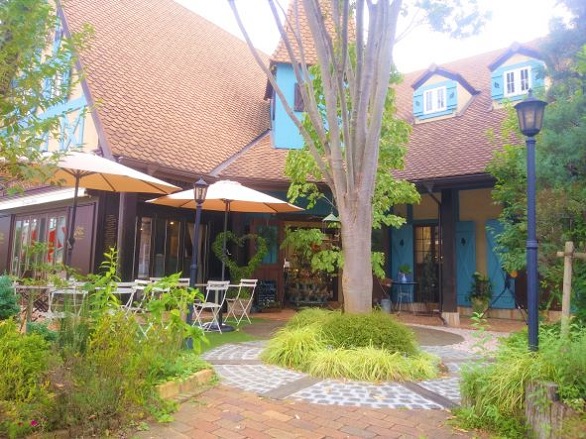 右手の緑の茂みの中に、キレイな青壁のお店が見えます。
